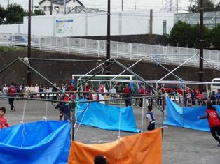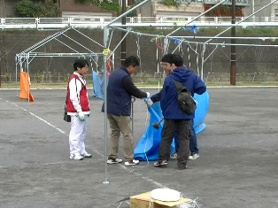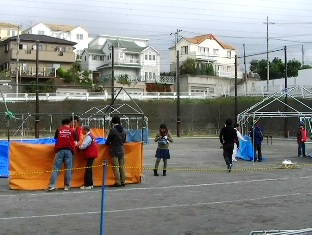 朝7:45からテントの運搬と組み立てを開始し、壁の作製やエリア、牢屋の設営をしました。
